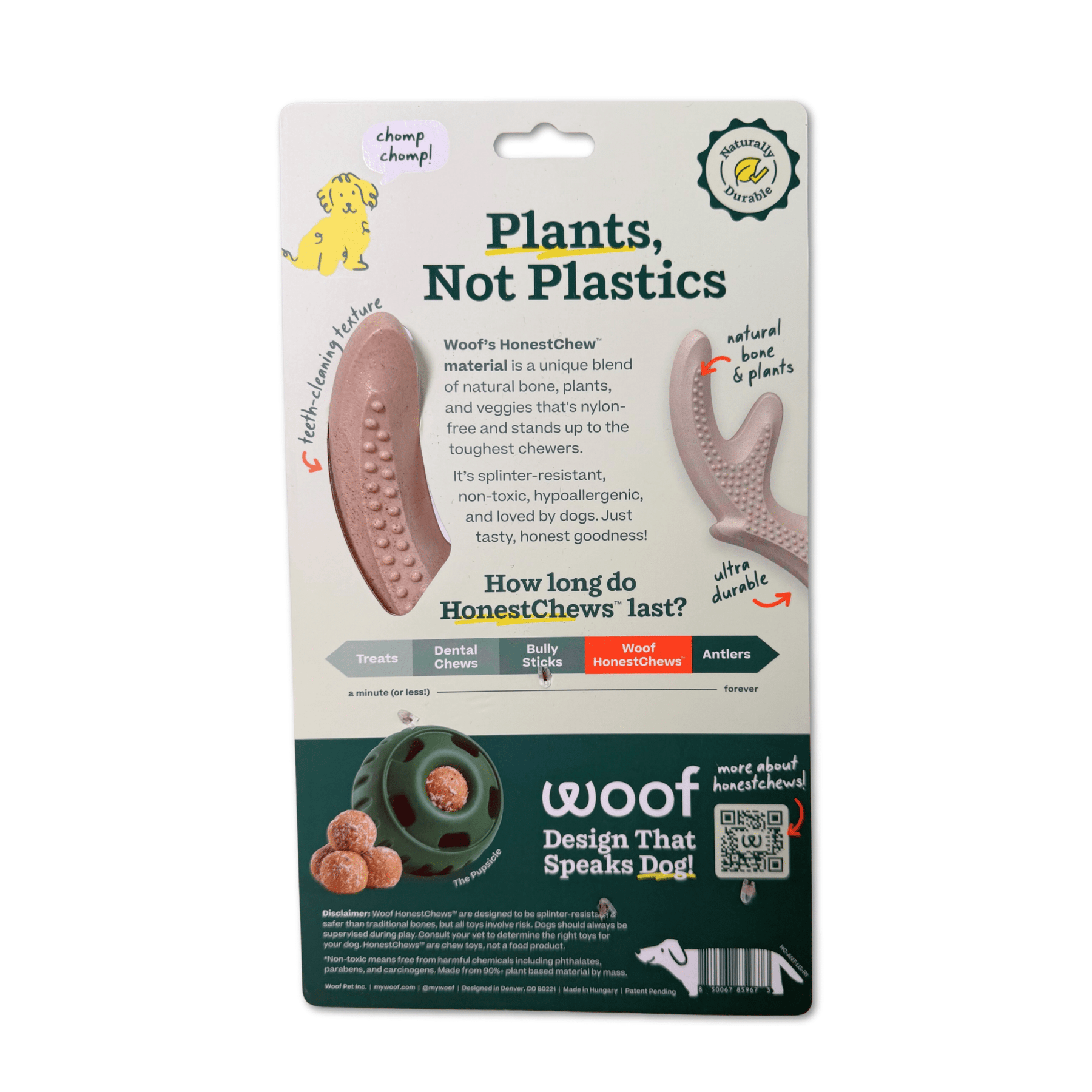 Calling all power chewers! Woof’s ultra-durable chewbone is powered by plants, not plastic. Lots of dog chews claim they’re natural — but look closer and you’ll find plastic, petroleum, and mystery flavors. HonestChew lives up to its name. Made with food-grade, plant-based ingredients like cellulose (a naturally tough fiber that gives plants their structure) and real antler for a satisfying chew time and gnaw-worthy flavor. Splinter-resistant and hypoallergenic, it’s a safer, more durable alternative to rawhide and traditional bones (healthier for teeth, too!). Got a dog with an appetite for destruction? HonestChew’s for you.